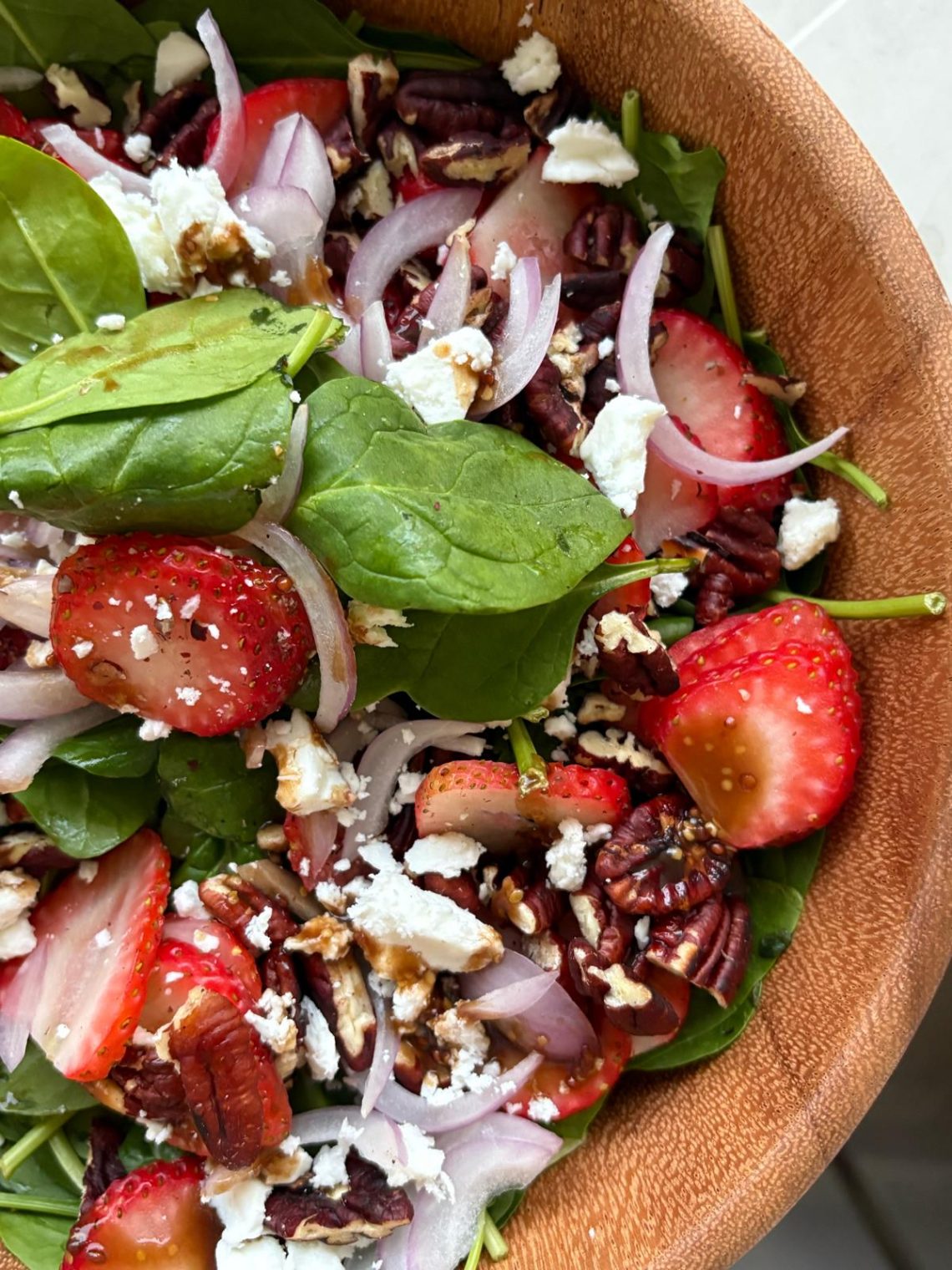 There’s something irresistible about the way sweet, juicy strawberries pair with earthy baby spinach, creamy feta, and the crunch of toasted pecans.