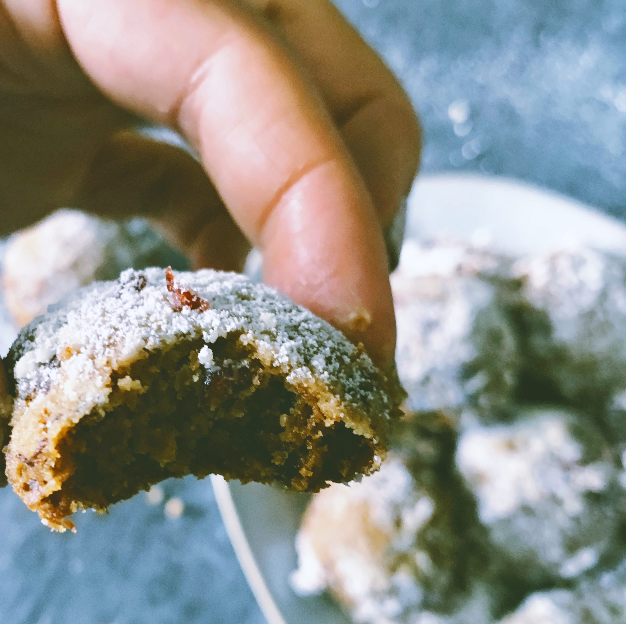 - Place 2-3 Tablespoons confectioners’ sugar in a shallow bowl and roll each cookie until coated. Add a dusting of confectioners' sugar if you like with a seive.
