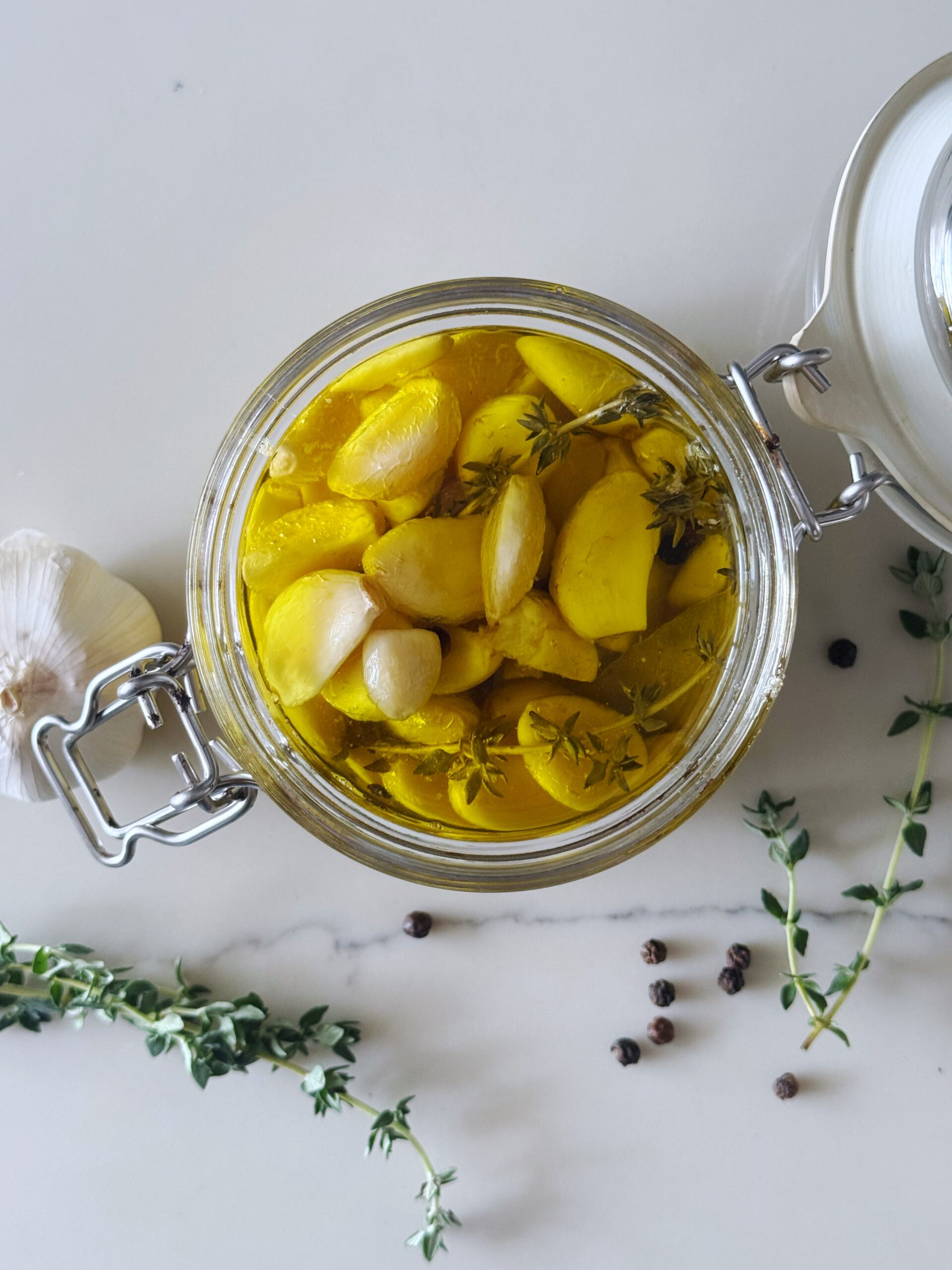 This garlic confit uses extra virgin olive oil, a heart-healthy, anti-inflammatory fat, and fresh aromatics like thyme, bay leaf, and peppercorns for depth. Unlike store-bought versions that may contain preservatives, refined oils, or unnecessary additives, this homemade confit is 100% clean, wholesome, and made from ingredients you can pronounce.