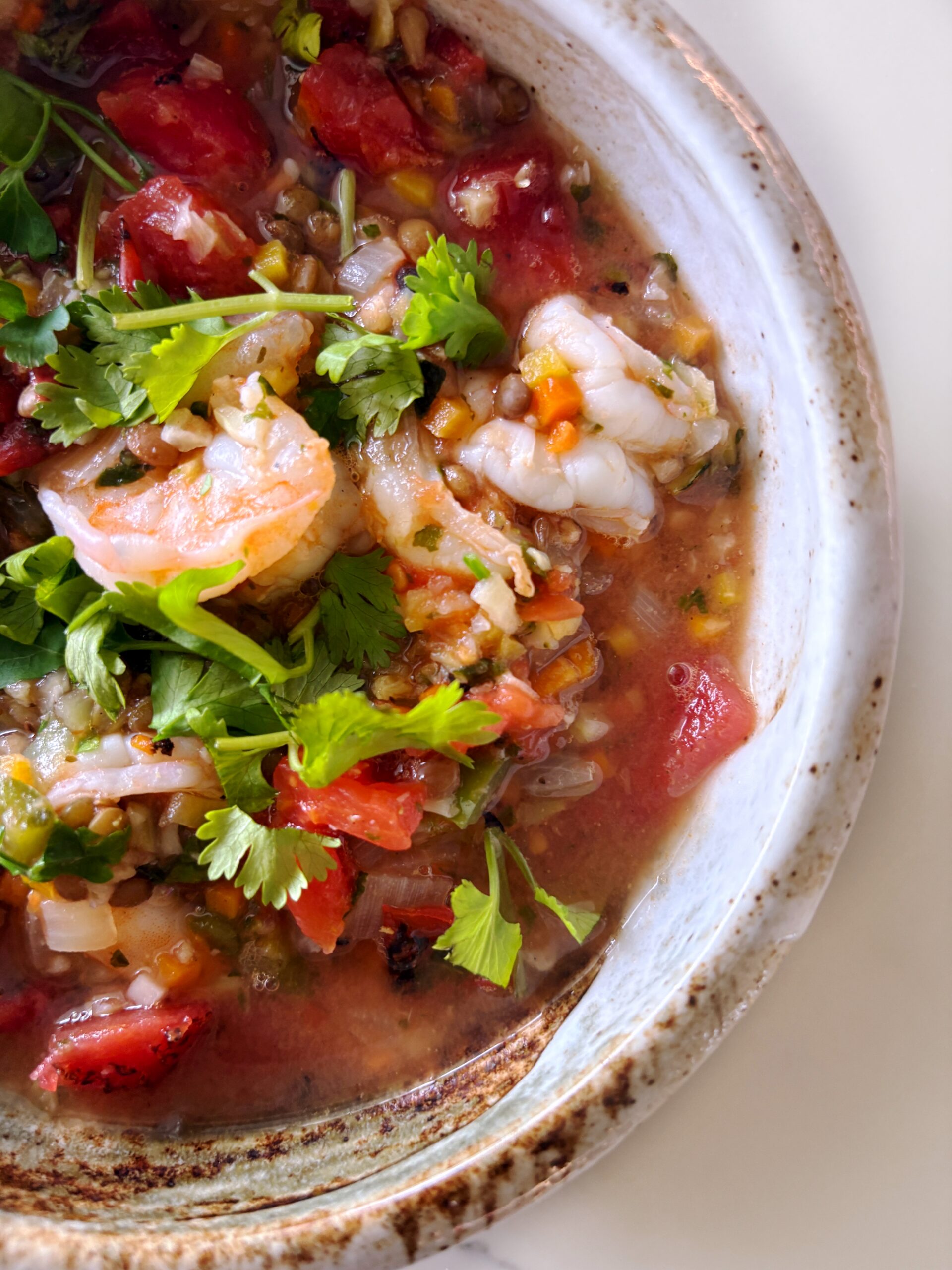 A hearty Mexican-inspired shrimp and lentil stew with fire-roasted tomatoes, herbs, and lime. A nourishing one-pot meal ready in 30 minutes.